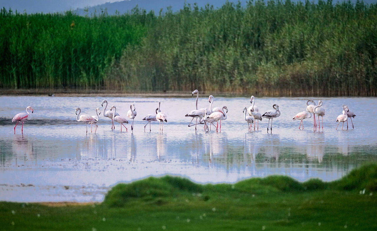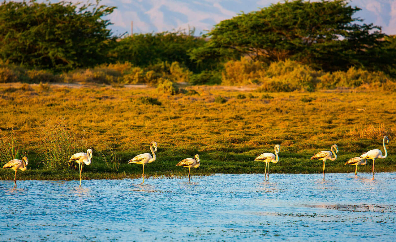 In den Lagunen von Salalah wartet ein weiteres Highlight: Flamingos. Doch hier siehst du sie oft in strahlendem Weiß statt im typischen Rosa. Je länger sie in der Region verweilen, desto heller wird ihr Gefieder – ein faszinierender Kontrast zum türkisblauen Wasser.